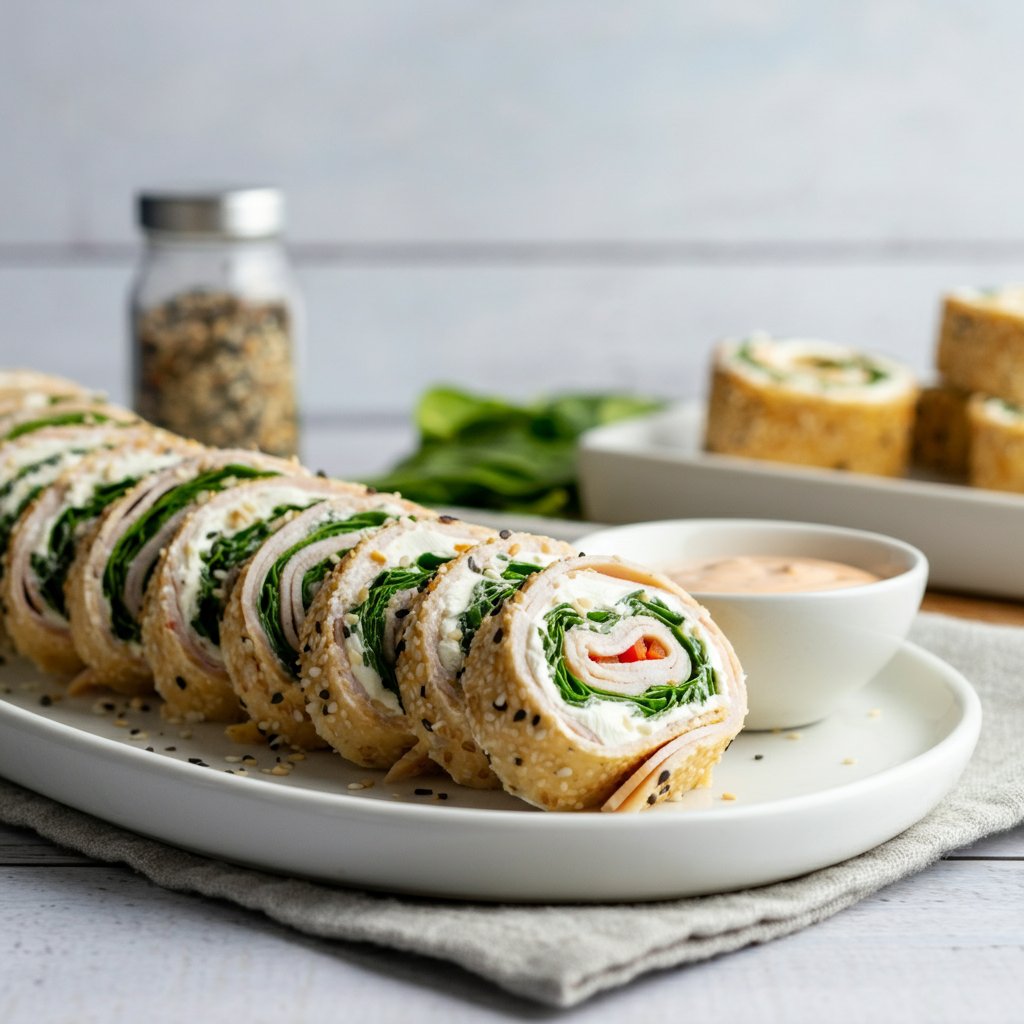 Turkey roll ups and cream cheese on a plate